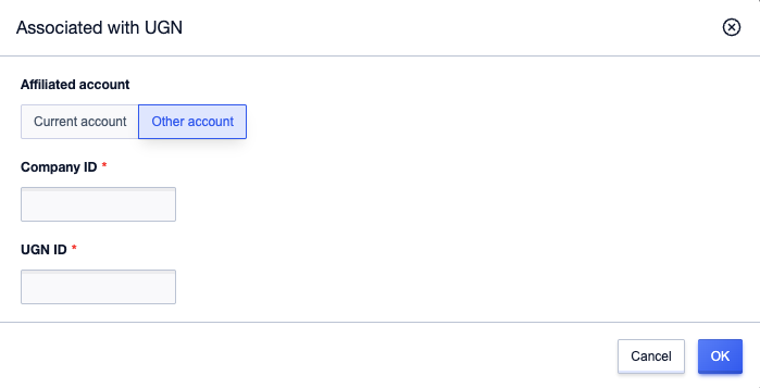 1. In the pop-up window, set the account type to Other account, enter the Company ID of the account to which the target UGN instance belongs, and the UGN ID of the UGN instance, then click OK.